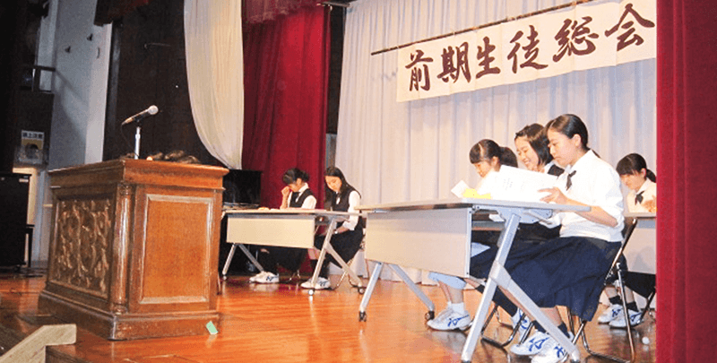 「前期生徒総会」委員会が1年間活動するための方針を考え、生徒全員による承認を行います。